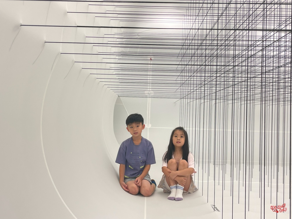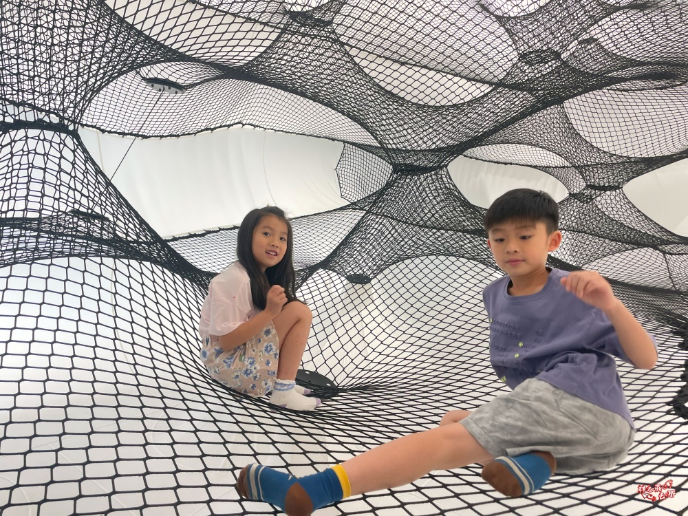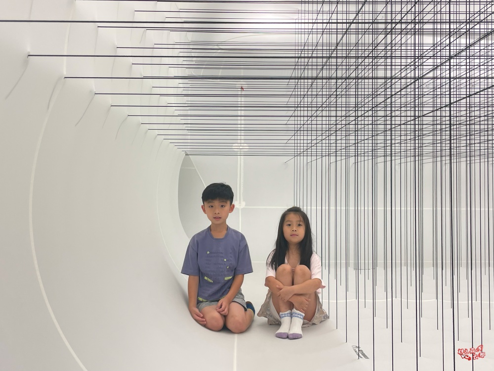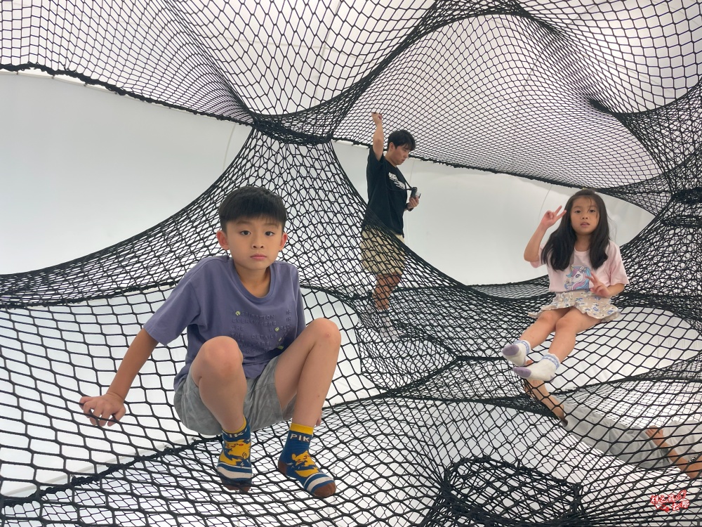 一開始走進展場,就被那如白霧般輕盈的氣墊與懸吊的黑色網子吸引目光,小朋友馬上脫了鞋跳進網中,不用教、也不怕,蹦蹦跳跳穿梭在立體網格之間,像是進入了一座夢中的太空迷宮。而《String Taichung》那一區,則是節奏緩慢、沉靜許多的氛圍。走進那整齊排列的黑色線條中,彷彿身體瞬間變小,被無限放大的結構包圍著,腳步自然放輕,視線被牽引,內心也跟著靜了下來。