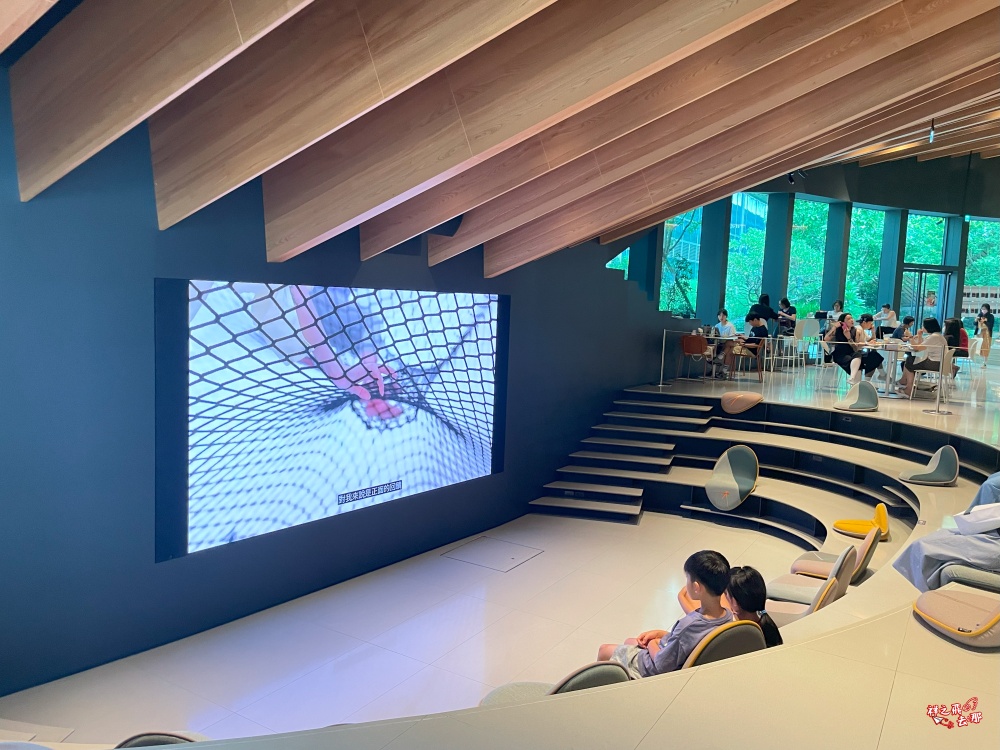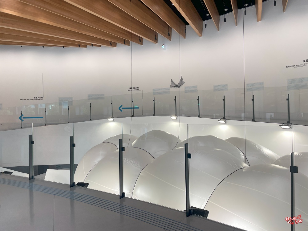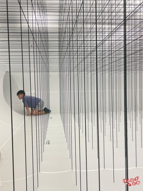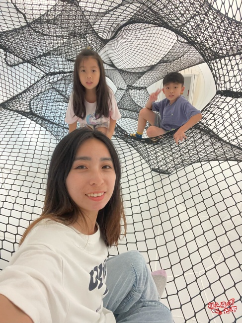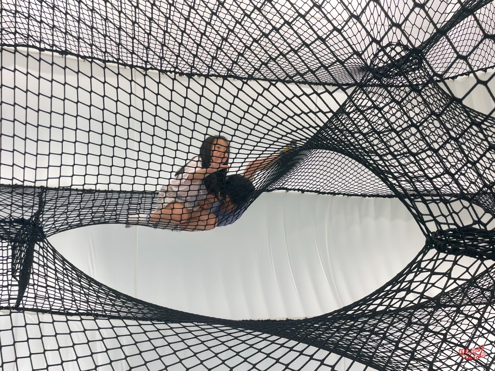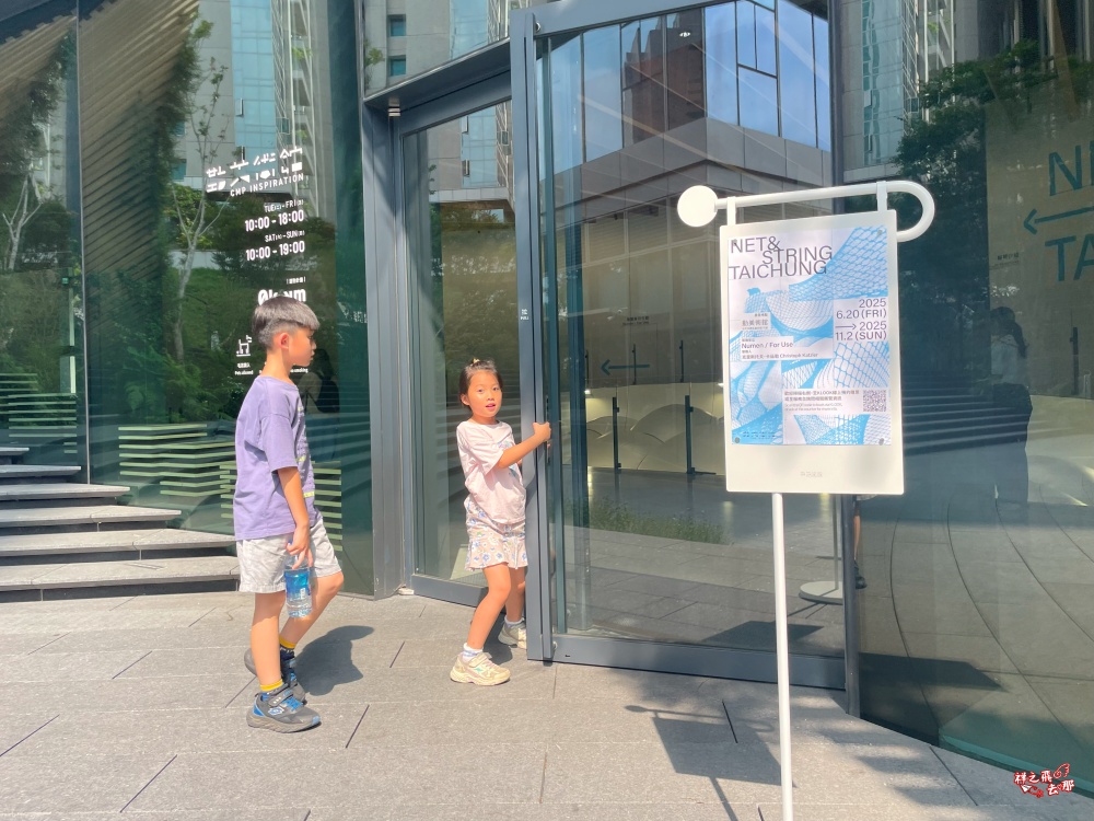 一開始走進展場,就被那如白霧般輕盈的氣墊與懸吊的黑色網子吸引目光,小朋友馬上脫了鞋跳進網中,不用教、也不怕,蹦蹦跳跳穿梭在立體網格之間,像是進入了一座夢中的太空迷宮。而《String Taichung》那一區,則是節奏緩慢、沉靜許多的氛圍。走進那整齊排列的黑色線條中,彷彿身體瞬間變小,被無限放大的結構包圍著,腳步自然放輕,視線被牽引,內心也跟著靜了下來。