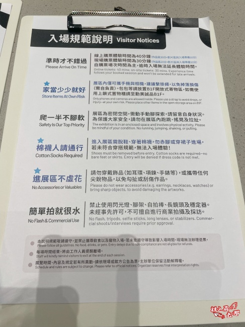 - 進入展區需脫鞋,請務必穿著棉質襪子及穿著便於活動的服裝,勿赤腳或穿著裙子入場(其他材質襪子須另加穿棉襪入場)。