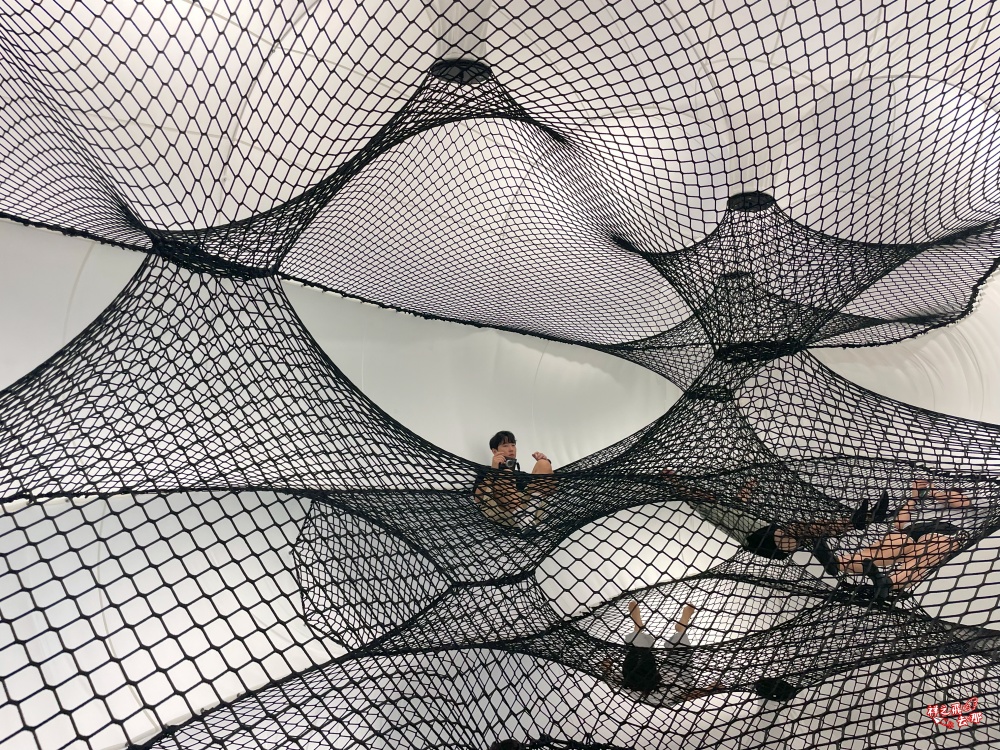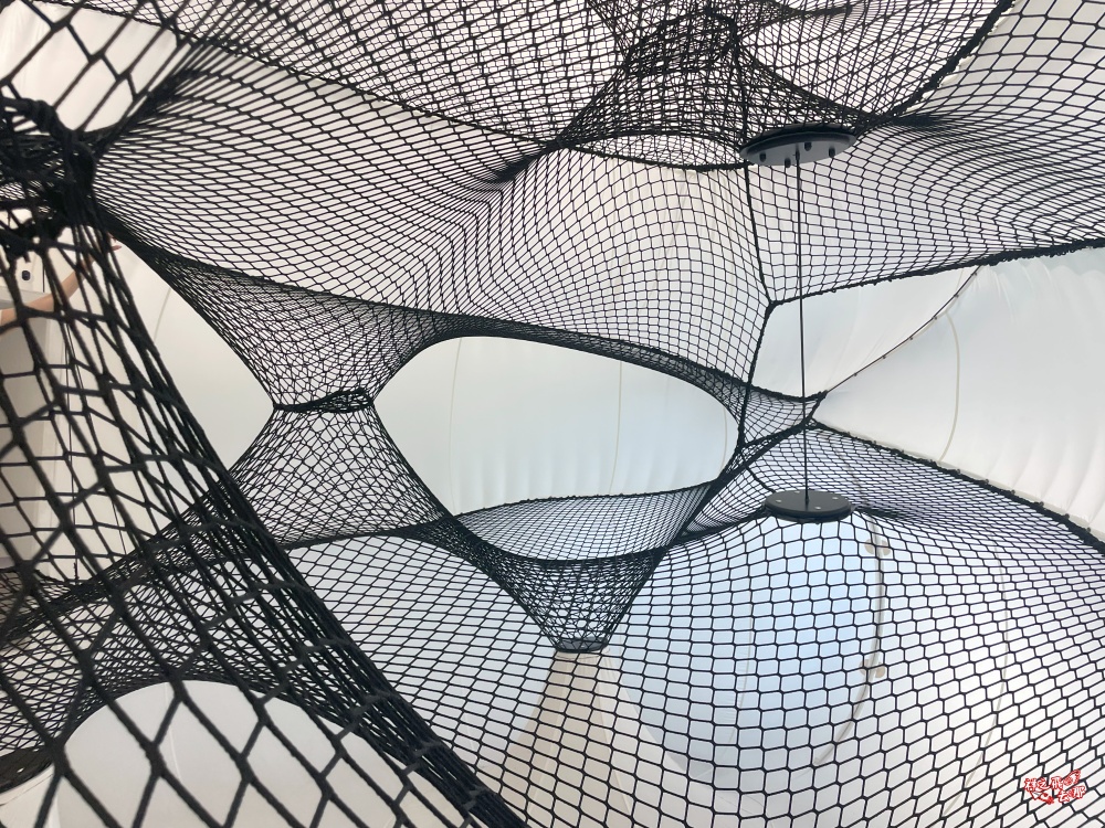 這次展出的兩件大型裝置作品《Net Taichung》與《String Taichung》,不是只能遠觀的藝術品,而是可以真正走進、穿梭、甚至用身體參與的空間裝置。你可以踩上網狀結構,感受彈性與空氣支撐的回饋,也可以在一層層拉直的繩索間爬行探索,像是進入一座以線條編織的夢境迷宮。整個展覽打破了傳統「看展」的界線,邀請每一位觀者親自走入場域,用腳步、手勢、甚至玩耍的姿態,重新體會什麼是與藝術「互動」。