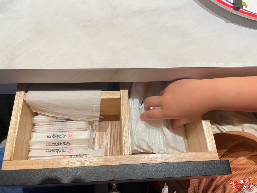 座位設計也很貼心,每張桌子旁邊都有設計抽屜,裡面備有面紙、濕紙巾、牙籤等基本用品,拿取方便又不佔空間。