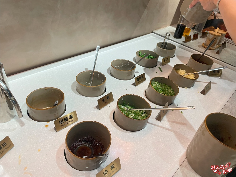 調味區的選項也很齊全,像是胡麻醬、沙茶、蔥花、蘿蔔泥、蒜泥、辣油、香油等都有。