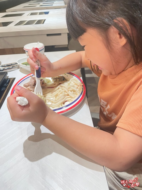 特別注意到很秋鍋物在親子友善的部分做得不錯,兒童餐具準備得很用心,不只是尺寸小巧適合小手抓握,顏色也繽紛可愛,光是看到就讓孩子食慾大開。